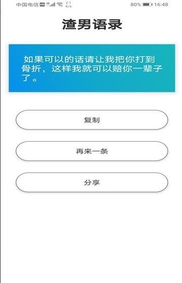 人类语录是一款超级有用的语录生成软件。专门为喜欢点评或经典语录的广大朋友打造的,这里的语录类型依然相当丰富,乡土情话、毒鸡汤、精美语录,带给大家不少欢乐。喜欢的朋友,快来下载