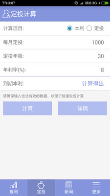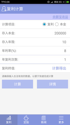 复利计算器是用于计算复利收益的理财计算工具,可以根据本金计算出复利的终值,反之,根据需要获得的复利终值计算出所需要的本金,后期会继续开放计算其他项目的功能,本应用界面清爽,操作简单,力求做到简单易用,节约你宝贵的时间。