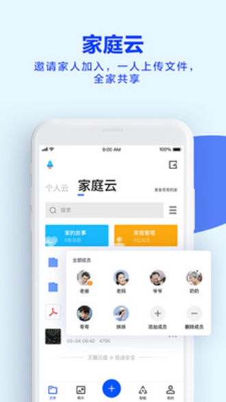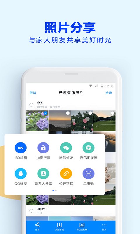一款家庭共享云盘软件,提供安全、智能、便捷、不限速的个人、家庭云存储服务。支持多类型文件的分享,用户可选择或多选想要分享的文件、生成分享链接发给好友。储存在云盘的音乐、视频无需下载,直接在线播放。支持QQ和微信一键登录,既方便又快捷,让你轻松就可以使用。