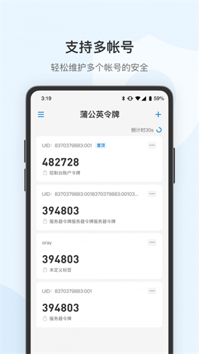 蒲公英令牌是一款超好用的账户保护工具,其可支持多个账号同时使用打开自动生成安全认证二维码,每过十秒就会进行二维码刷新,在扫描二维码经过安全认证后即可编辑查看手机的隐私内容了。有需要的用户赶紧下载吧!