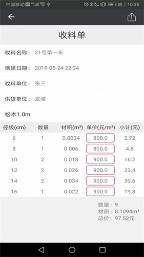 3.其可同时计算多种规格的材积,输入单价即可计算出木材金额