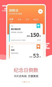 纪念日倒数日这是一款便捷的生活软件,帮助用户更加方便的记录下重要的日子,在软件中随意的添加不同的日期那么就会为你带来倒计时服务,用户可以清楚的查看到重要的日子所剩余的时间,让你最重要的日子不在出现遗忘,很好的生活助手哦。