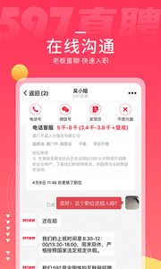 597直聘官方版是一款在线求职找工作神器,你可以在这里获取到上千万个职位,几十万求职者都在这里寻找 工作,各种各样的行业职位你都可以一键筛选查找,想要找什么工作都能满足你,智能的职位推算方法,可以为你推送更多适合你的岗位,让你更快速的入职,你的投递状态都可以随时查询进度。