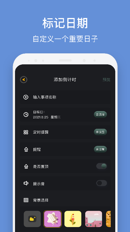 倒数日321这是一款非常实用的生活软件,用户在软件中可以清晰的记录下重要的日子,例如:生日、结婚纪念日、会议时间等,添加事件名称每日都会准时为我们完成倒数,让用户清晰的查看到重要日子倒数时间情况,避免出现遗忘。