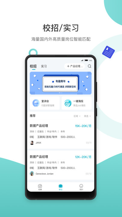 求职鸥这款软件帮助广大用户轻松的在线进行求职,海量的岗位都能够根据自己的需求来完成简历投递,系统会根据用户的行业意向来为你推荐合适的岗位,还能以就近的企业优先安排,让你上班通勤时间更加缩短,欢迎广大求职的用户免费下载使用。