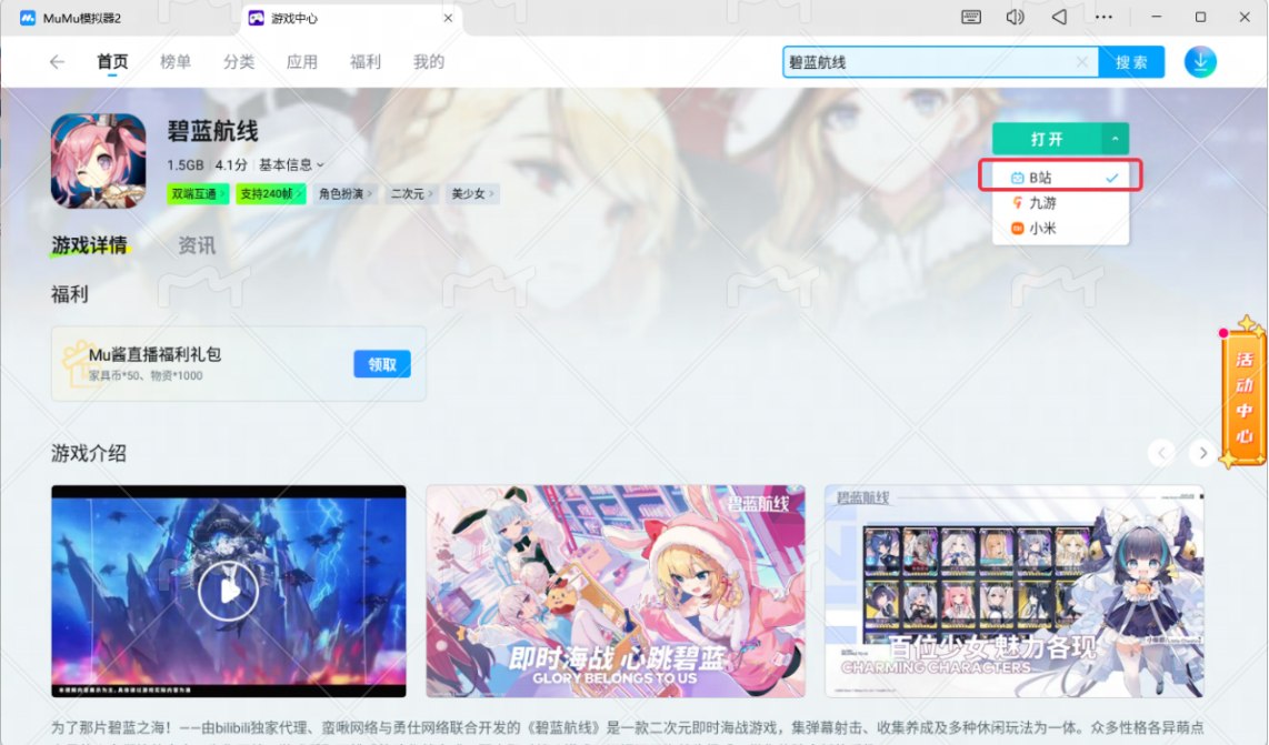 方法一:启动模拟器,在游戏中心搜索“碧蓝航线”,点击下载B站版本。