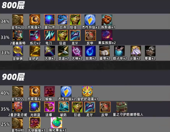 400层以上开始刷特殊奖励,2个大妮蔻加40块钱,可以提升追出三星高费的概率,还有黎明猫、光盾蕾欧娜,这样的强力的神器组合,500层的奖励非常复杂,不是很推荐收,100金币如果不能转换即时战力,很容易变成老8,剩下的奖励容易草操作不过来。600层有宗师套,不过这赛季的4宗师不会提供全队加成,除非有教师理事会,700层有概率收到3无终恨意和妮蔻,开出高圣盾很强,还有8张两星五费的奖励。800层有神装两星卡牌以及全部散件的奖励,900层有40%的概率收到两个大妮蔻的奖励,35%概率收到神装萨勒芬妮以及星守假人,25%概率收到3个光明偷偷以及三个强化果实,战力提升非常高。