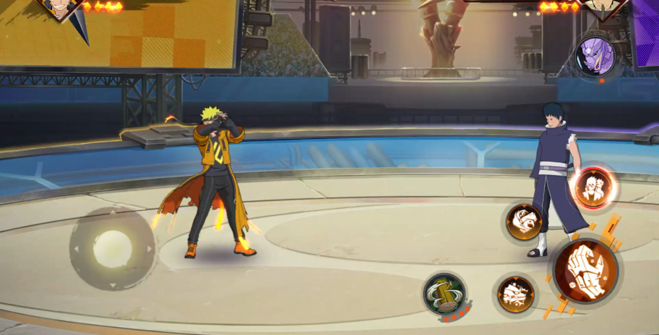 佐助的普攻共5A,1A和2A都是平推,3A向前突进攻击,4A击飞敌人,5A附带灼烧效果。佐助普攻的最后1 A是火剑与雷剑交替攻击,使用完火剑下次普攻是雷剑。一技能炎遁地炎,向前冲刺对后方的敌人造成伤害,技能还有持续灼烧的效果,二技能须佐能乎雷之矢,后撤向前攻击。鸣人和佐助在一、二技能的后摇期间,奥义图标都会产生变化,按下能消耗一颗奥义点召唤对方出场打出连携技。一技能后摇期间点按奥义键,能打出连携技灼遁光轮疾风漆黑矢零式,往前冲刺持续造成伤害,二技能后摇期间使用奥义,打出连携技雷尾兽玉,向前持续造成伤害。