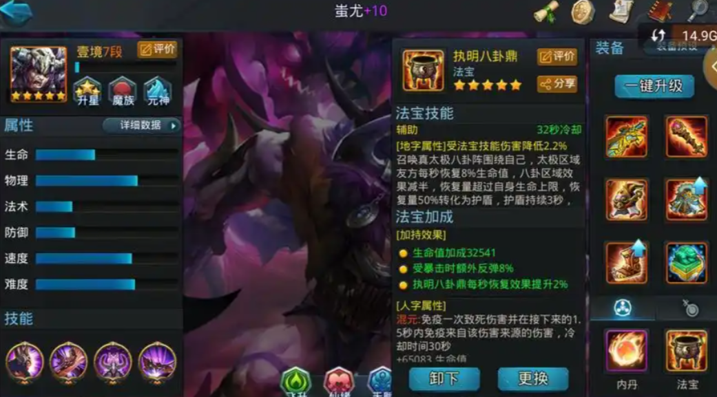 魔力斗篷是用来防止魔法伤害的用的,针对一些爆发高的法师英雄很有效,能抵挡大量的法术伤害,在敌方有多名法师时一定要出,能增加蚩尤的站场时间。不死鸟之眼这个装备是为了增加续航能力,蚩尤的大招本就有回血的效果,加上装备提供的特效,能在残血时提供更强的韧性,也能应对一些比较强的法师。防御装备完成之后可以选择碎星锤提高穿透,特效破甲能将敌人的防御破开一部分,对自己和队友都有辅助能力。