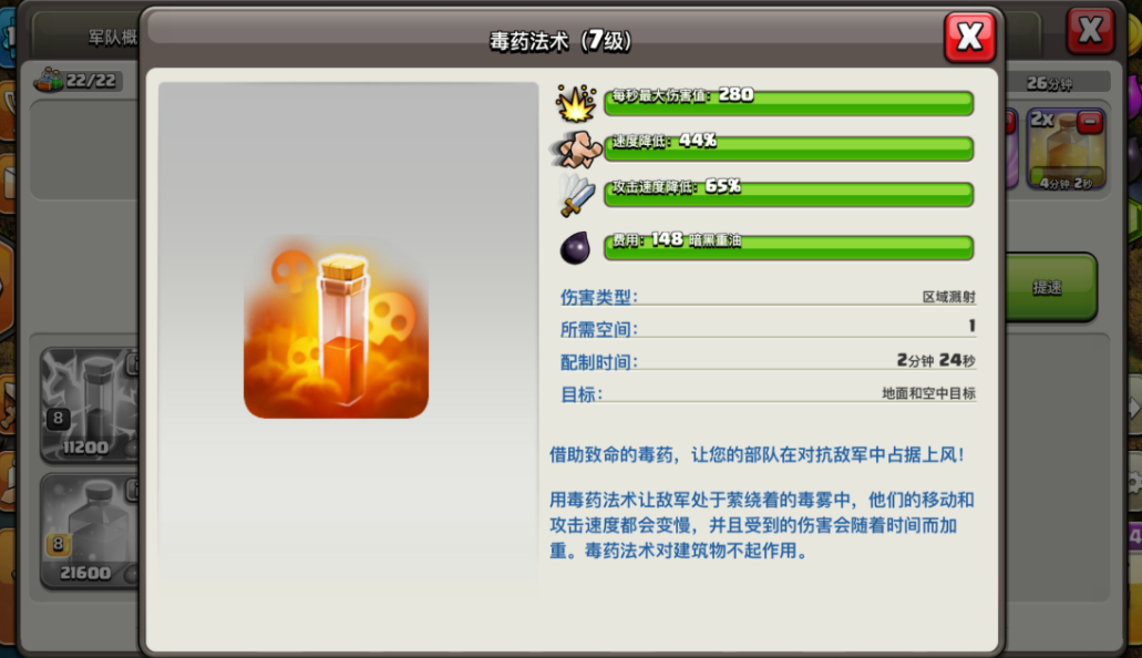 毒药相比闪电来说对空间更加节省,伤害触发更加稳定,不管是血量低还是高都能用,包括空中的援军单位也能伤害到。对英雄单位使用时伤害虽然不高,但可以大幅减速,让英雄和前方的部队进行脱节,这样就能针对英雄制定击杀战术了。一些后排部队比如女巫、炸弹人使用毒药可以降速,也就能降低输出,能保住一些核心的建筑。