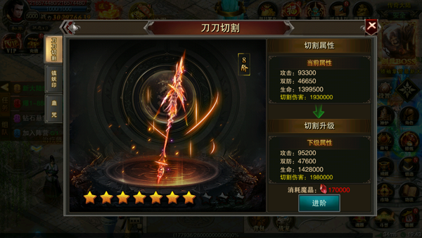 切割系统的作用很大,在前期多小伙伴们的帮助非常多,你的切割升级升的越高,切割伤害就越高,切割系统的伤害是在基础伤害上增加你的切割伤害,消耗魔晶即可进阶切割系统,魔晶的获得可以在商店使用钻石和元宝购买,每日可以购买一百次,当然了使用战功也是可以兑换魔晶的,战功的获得是在咱们游戏内的跨服活动英雄会内获取,每周三,周六的晚上19:00-19:40开放,大家可以通过这个时间段进行跨服活动获得军功来兑换魔晶用来圣级切割系统。