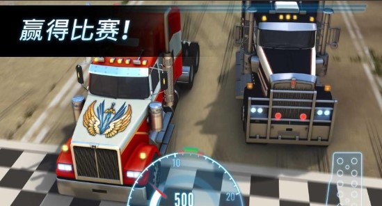 3.驾驶自己的卡车去参与竞速,通过虚拟按键操作,可以看到时速表,可以看到自己现在的速度,还能灵活操作去超越对手。