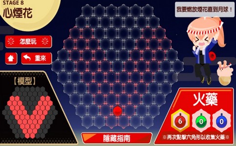 焰火益智游戏是作者自行设计的一款互动焰火手游。玩家需要设计自己的烟花图案来发射不同形状的烟花。选择火药,将火药放入六角形,然后释放火药,所以这是我们努力的方向。如果所有的火药都放了,我们就照样放火药吧。
