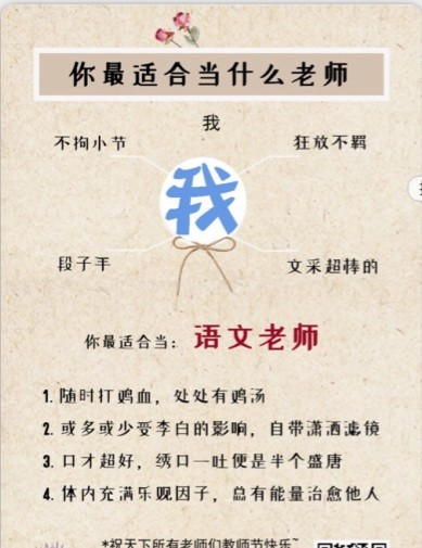 什么样的老师最适合你是一款非常有趣的测试游戏,游戏会从想象力、逻辑性等方面考验你,通过你的选择和大数据的比对得出结果,看看你最适合做什么样的老师。游戏试题没有固定答案,每个人都可以参加考试。在此,我提前祝每一位老师教师节快乐。