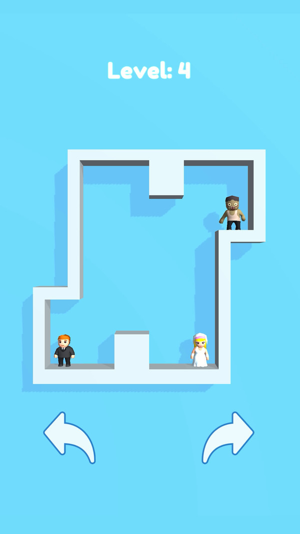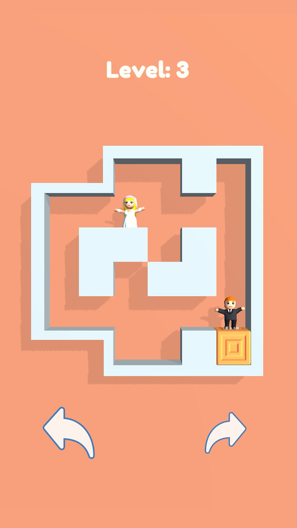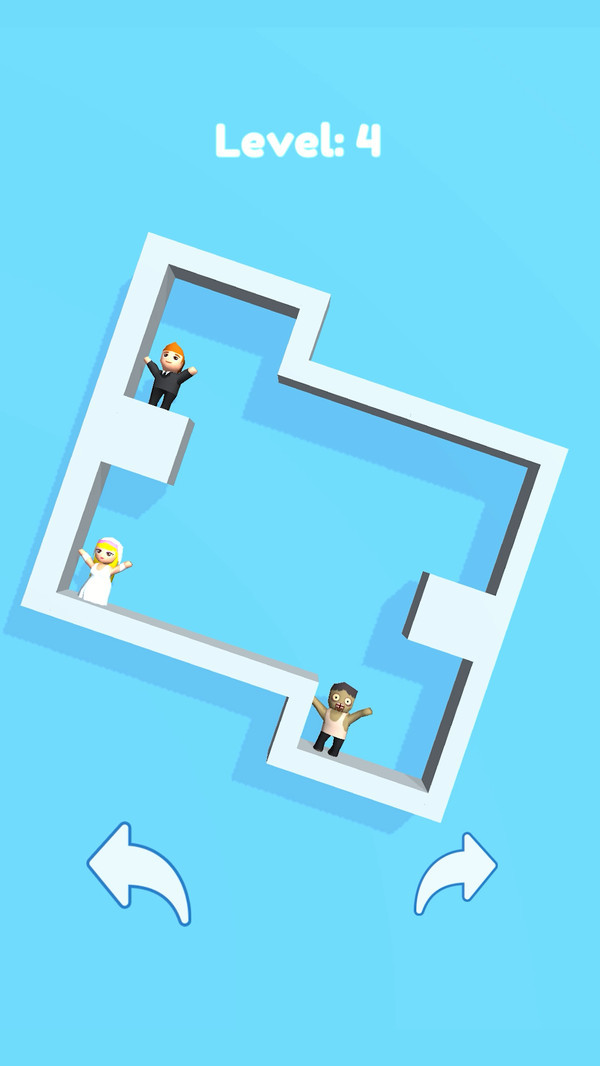 游戏的主题非常有趣,通过把新娘和新郎带到一起,你可以完成游戏关卡的挑战。点击箭头或滑动旋转房间,让新娘新郎因重力倒下,利用旋转房间的效果创造更多优势,将僵尸成功的车放在关口,让新娘新郎安全相聚。