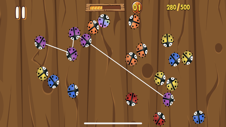 每个玩家都会看到很多瓢虫,只有找到相同的颜色并将它们连接起来才能消除这些瓢虫。