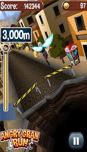 2、摇晃手机、抓屏控制老奶奶向前冲,路上捡到的金币可以用来购买有趣的道具和服装。