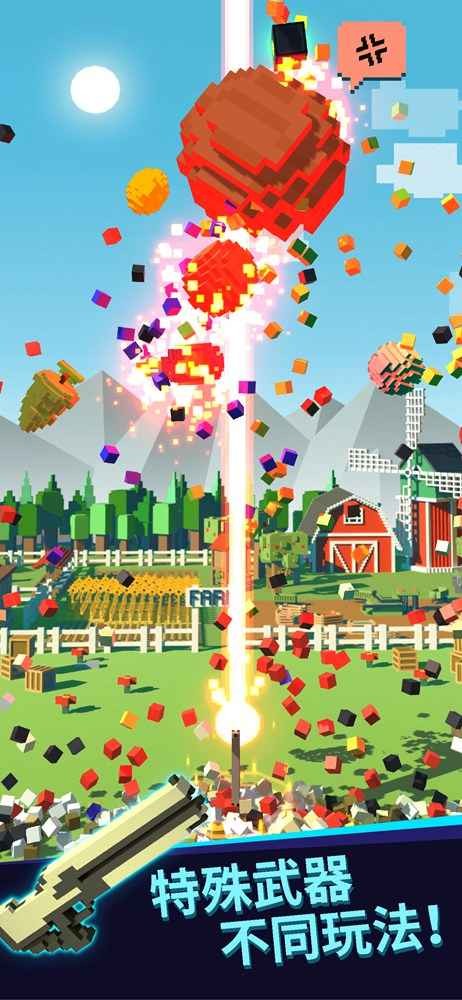 射击水果是一款非常有趣的休闲游戏,主要玩法是用枪射击,将空中的元素射击成功后即可获得积分,累积的积分到达相应位置后即可顺利通关,并获得相应的奖励,枪支种类繁多,每个关卡都有不同的内容,玩家解锁后即可顺利使用。