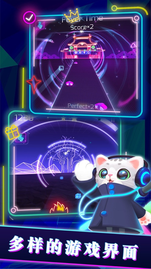 非常可爱的猫形象,各种酷炫的武器等等。切断游戏中出现的音符