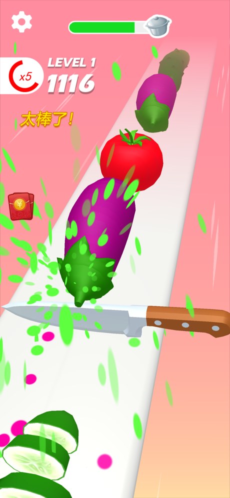 2、手指轻松的点击即可控制小刀切割,将所有的蔬菜和水果全部切割为一个个小块根本停不下来的乐趣;